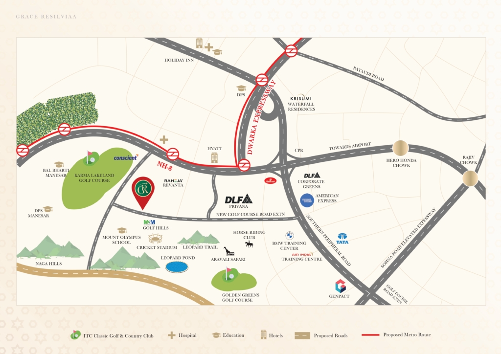 Grace Resilviaa, Sector 78 Gurugram, is a premium residential development strategically located on a 60-meter-wide road, directly opposite M3M Golf Hills. Offering seamless connectivity to the SPR Road and the Delhi–Jaipur Highway, the project ensures smooth access to key business and lifestyle hubs.